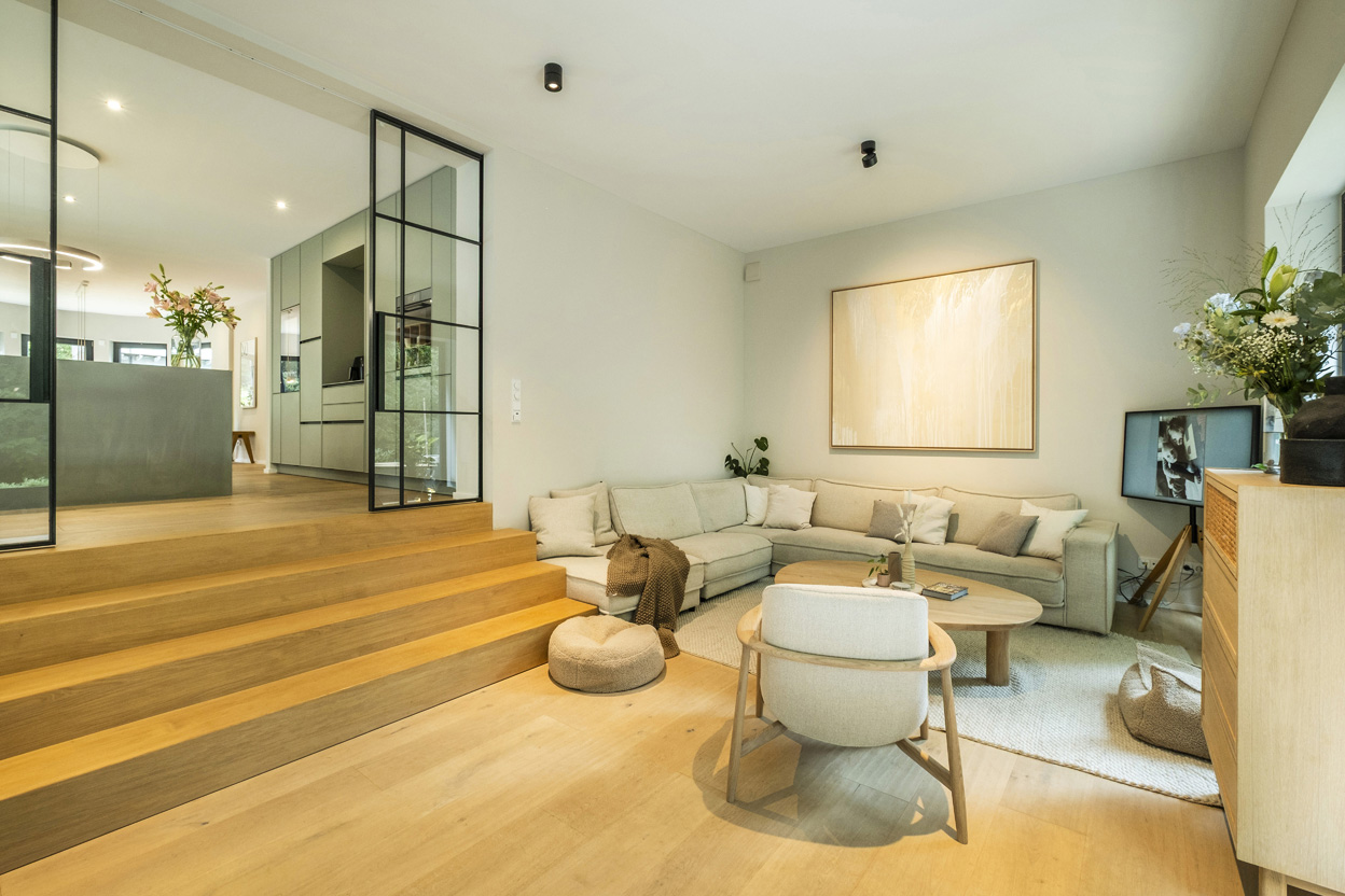 Absolut. Gerade durch die transparenten Loft-Türen und die Verwendung heller Materialien wie Eiche und Bouclé wirken Räume großzügiger. Der gezielte Einsatz des Edelstahl-Küchenblocks setzt einen klaren Fokuspunkt, der dem Raum Struktur verleiht, ohne ihn zu erdrücken.
