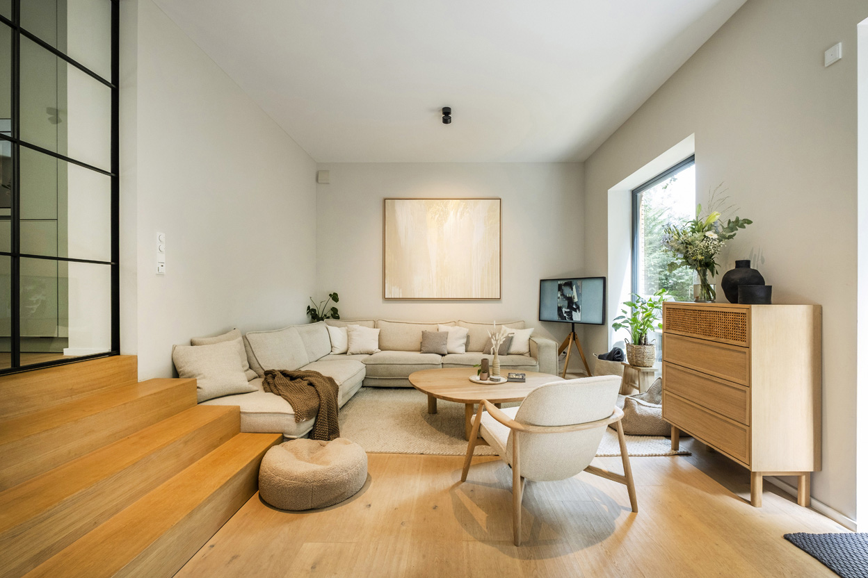 Während Stahl und Edelstahl für Präzision stehen, bringen Eiche und Bouclé die nötige Haptik und Seele in das Interieur. Das Naturholz der Möbel erdet den Raum, während die unregelmäßige, weiche Struktur des hellen Bouclé-Stoffs die harten Linien der Architektur sanft bricht. Dieser Kontrast sorgt dafür, dass das Haus trotz seines modernen Charakters eine einladende Geborgenheit ausstrahlt.