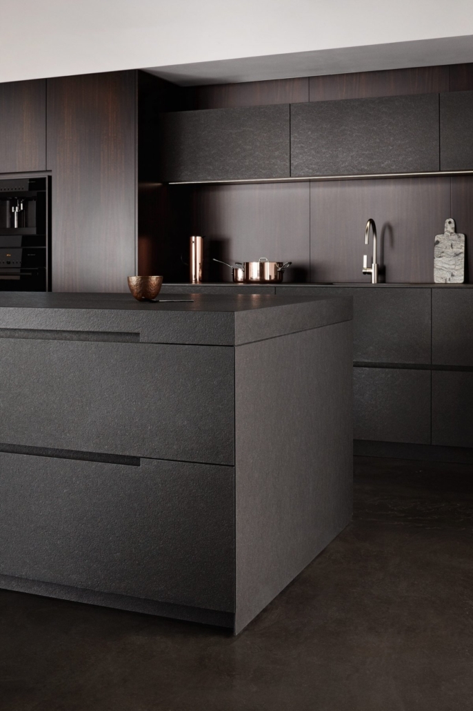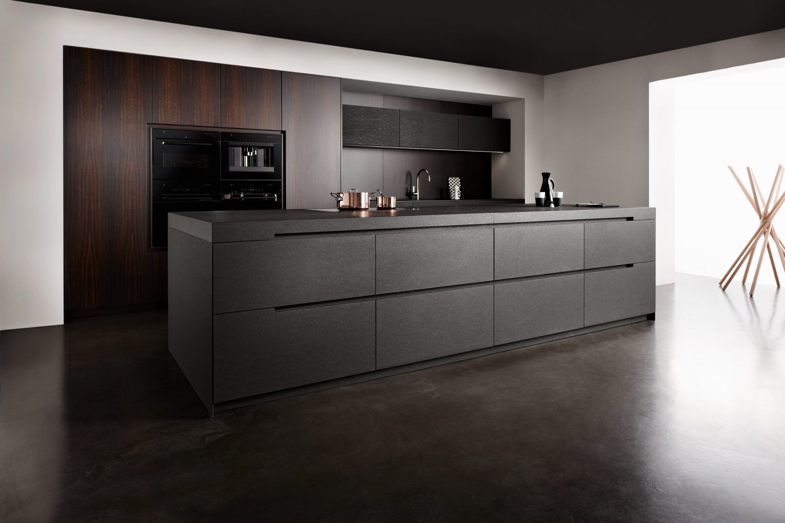 Spezielle Ausklinkung der massiven Steinarbeitsplatte ergibt einen Eingriff für die Auszüge